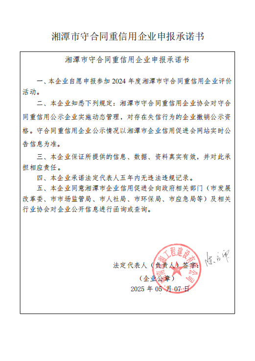 本企業(yè)根據(jù)《湘潭市守合同重信用企業(yè)申報(bào)規(guī)定》等編制 2024 年度企業(yè)信用報(bào)告書,并保證本報(bào)告書內(nèi)容真實(shí)、準(zhǔn)確、完整。